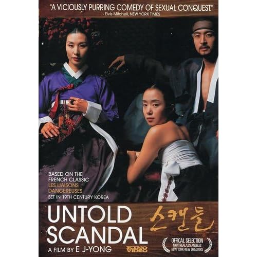 This was a very good movie. This version of the classic story was set in Korea in the late 1790's. I liked it a lot. It was so beautifully shot and the costumes were so lovely. This is from the movie's website: "Based on the novel Les Liaisons Dangereuses, Untold Scandal is set in aristocratic 18th century Korea at the end of the Chosun Dynasty. The irresistible temptress Lady Cho (Lee Mi-Suk) asks her cad of a younger cousin, Jo-won (Bae Yong-Jun), to deflower the innocent young Soh-ok (Lee So-Yeon), who is to become her husband's concubine. But his attentions soon shift elsewhere: to the graceful and aloof Lady Sook (Jeon Do-Yeaon) who lives according to her convictions as a Catholic. Jo-won becomes obsessed with seducing this chaste woman who has remained celibate for nine years since her husband's death. However, it proves to be more difficult than he expected when Chosun's notorious playboy sets out to conquer the most virtuous woman in the land." I would add... and unexpectedly falls in love with her.